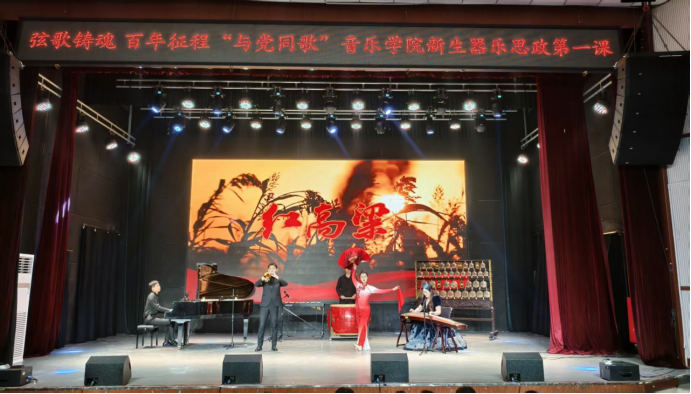 此次器乐思政课分为“星火燎原·革命之光”、“烽火淬炼·民族之魂”和“初心如磐·盛世之光”三个篇章,分别由音乐学院教工第一党支部书记张婷婷、纪检委员陈彩虹、教师党员曹宁主持。活动将器乐表演与党史教育深度融合,为2025级新生搭建了一个通过艺术感知历史、通过旋律体认时代的精神桥梁,使青年学子在音乐的熏陶中领悟红色传统的深厚力量与当代青年的责任担当。在尾声部分,器乐教研室党员教师共同献上《灯火里的中国》合奏节目,将现场氛围推向高潮。