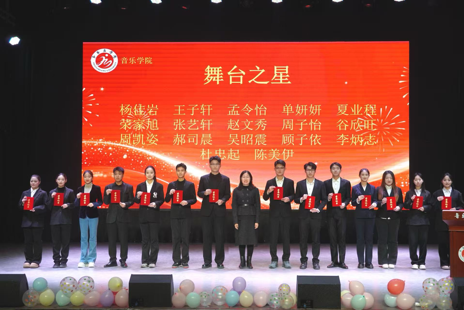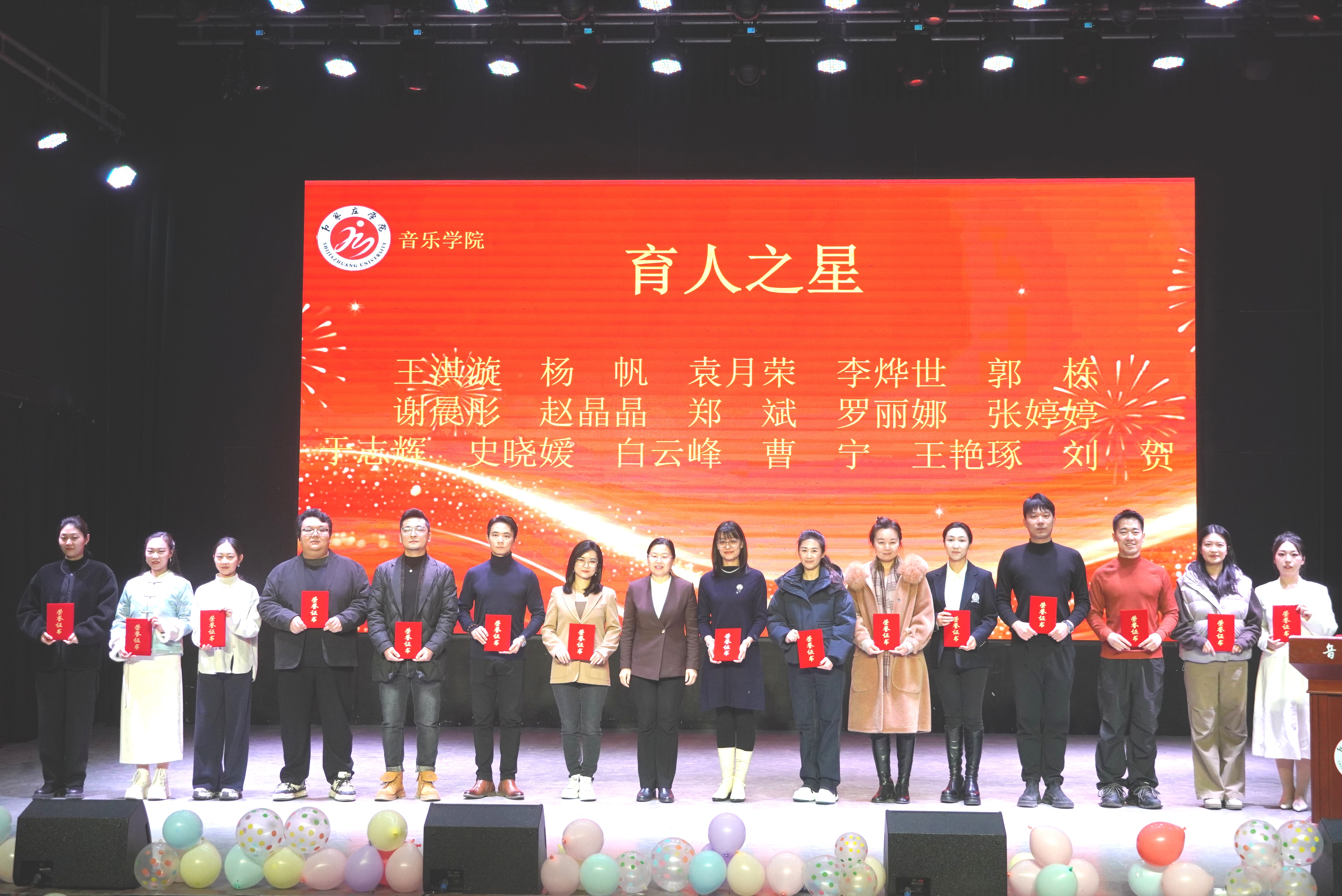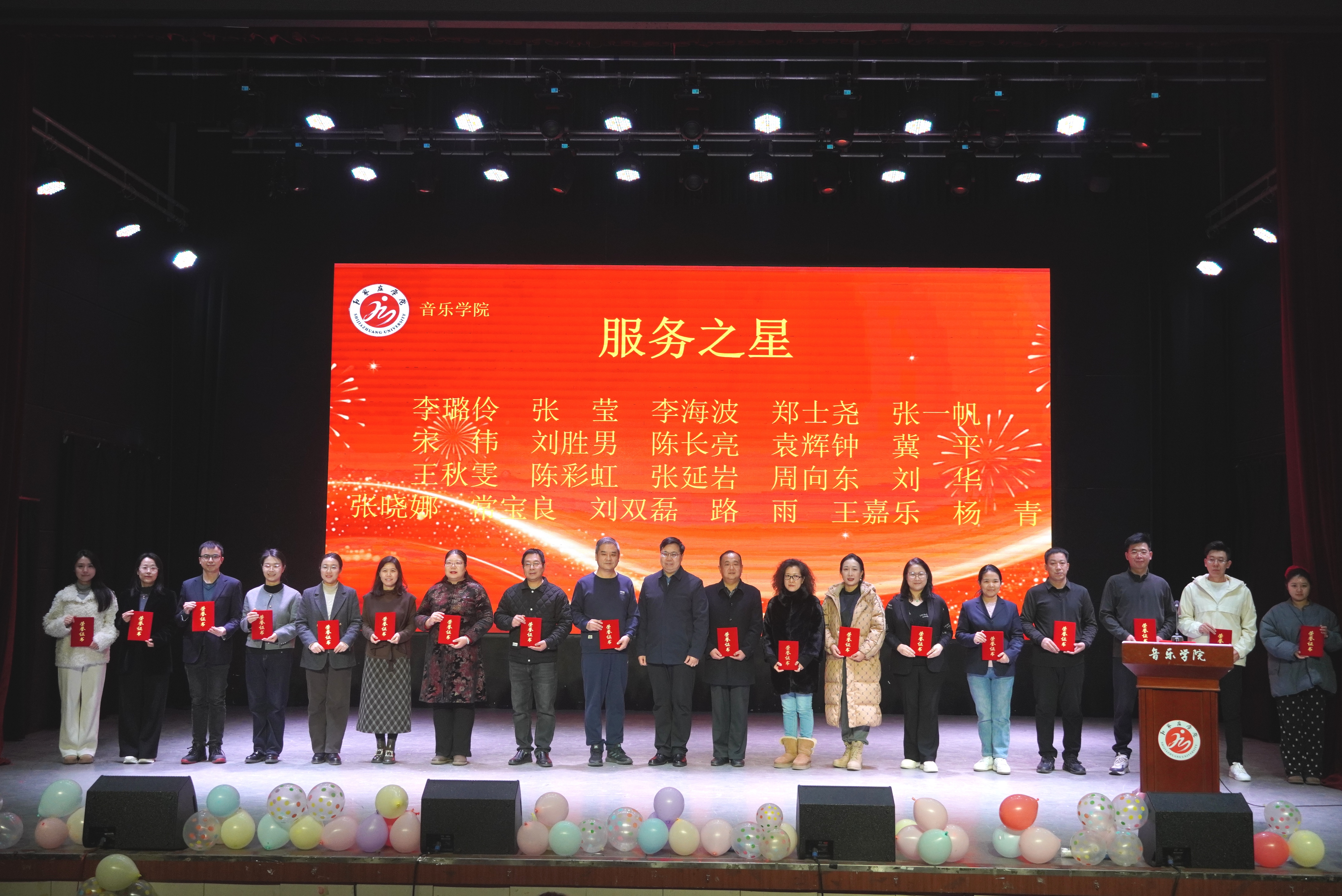 12月30日,音乐学院在北校区小礼堂举办“舞动芳华 乐启新程”2025年度表彰大会暨2026年元旦晚会。石家庄学院校长王永芹,党委常委、副校长冯宝强,党委常委、副校长李娟出席,办公室、后勤管理处负责人,音乐学院领导班子、教师代表及学生代表共计300余人参加。