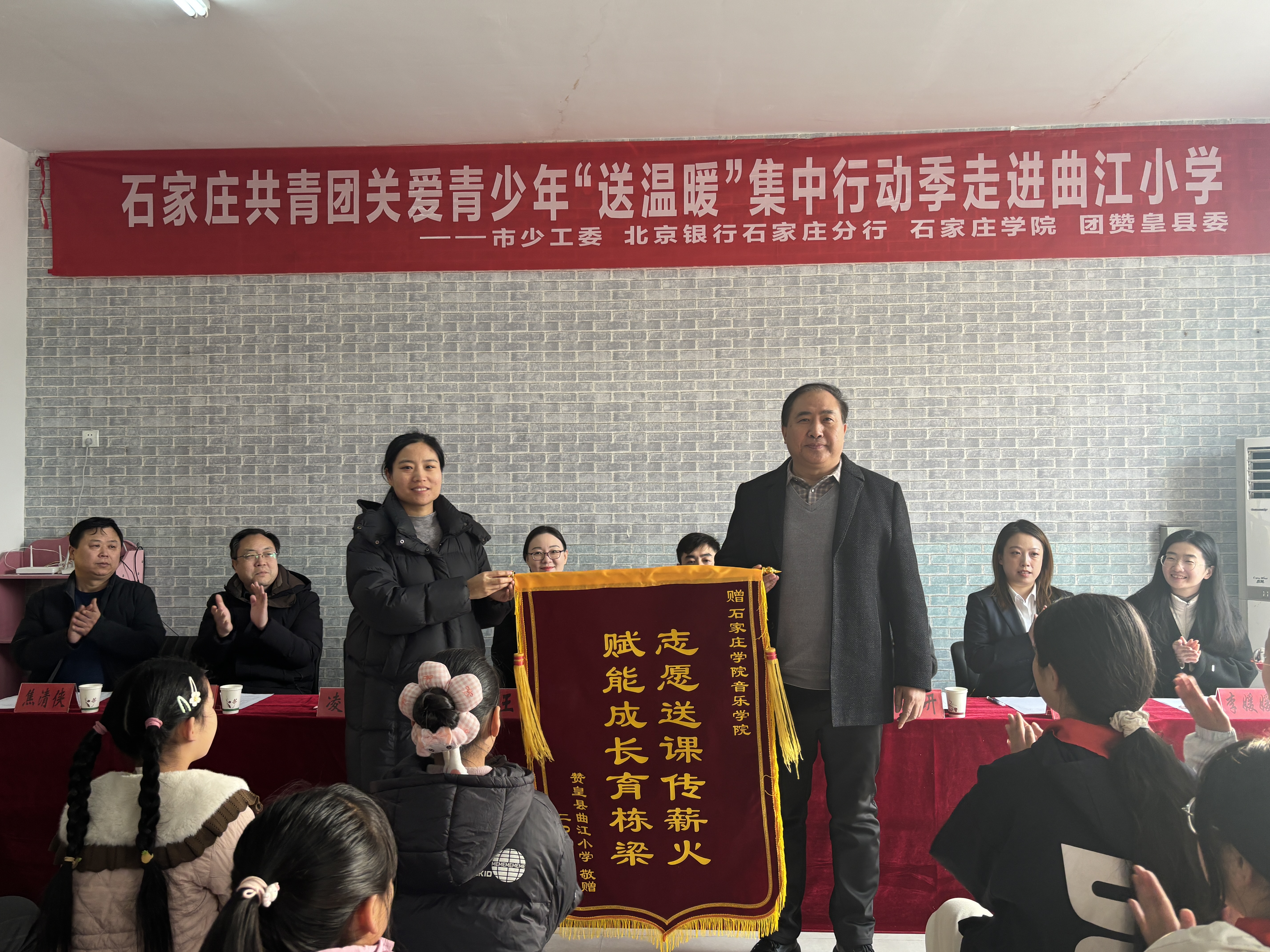 1月16日上午,石家庄共青团关爱青少年“送温暖”集中行动季暨“情系校园 爱暖童心”爱心助学活动在赞皇县曲江小学举行。共青团石家庄市委、赞皇县委有关负责同志,音乐学院党总支书记、教师代表参加活动。