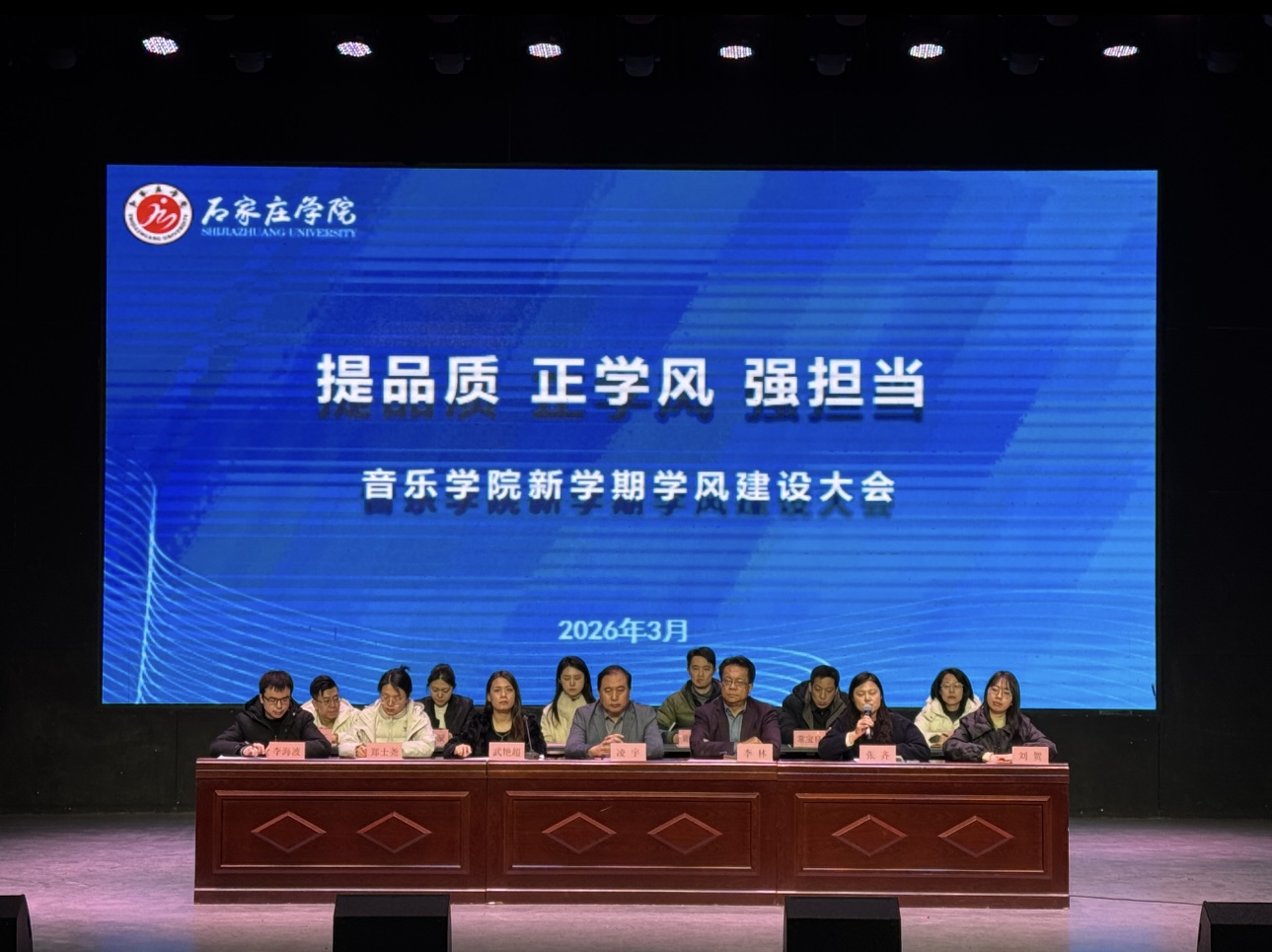 为切实提高育人质量,落实学校“学风建设年”实施方案,着力营造教风正、学风浓、校风优的育人环境,3月12日下午,音乐学院在小礼堂召开新学期学风建设专题大会。学院领导班子、专兼职辅导员、安全员、全体学生干部、宿舍长、以及2025级本科生参加了此次大会。大会由党总支副书记武艳超主持。